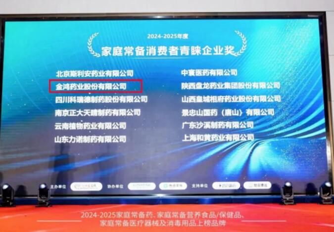 在此次“中国家庭常备药”评选中,金鸿药业股份有限公司荣获“2024-2025年度家庭常备消费者青睐企业奖”