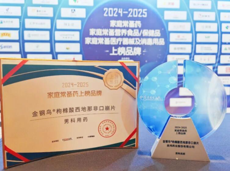 金鸿药业旗下核心产品金钢鸟®枸橼酸西地那非口崩片凭借创新剂型与临床效果,荣登“2024-2025年度家庭常备药(男科用药)上榜品牌”!